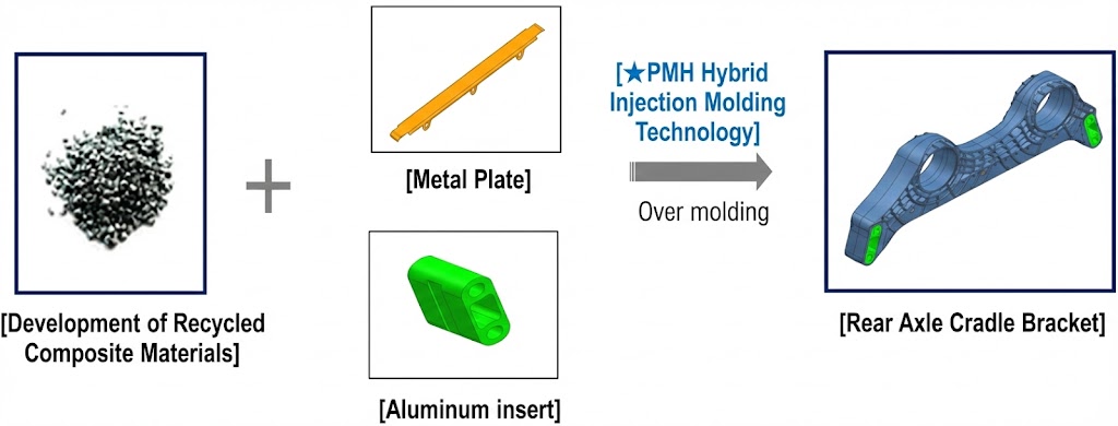 ØDevelopment and Localization of Recycled Plastic Composite Materials with Improved NVH Performance, and Development of Rear Axle Cradle Bracket Products Applying PMH Heterogeneous Material Hybrid Injection Technology